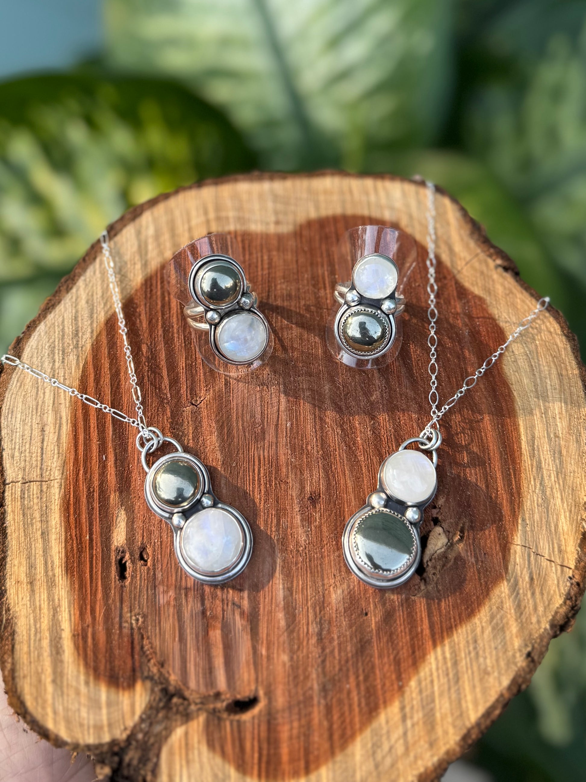 Moonstone supports intuition, divine feminine, transformation & encourages trust in the flow of life. Pyrite gives you the determination & willpower to get there!