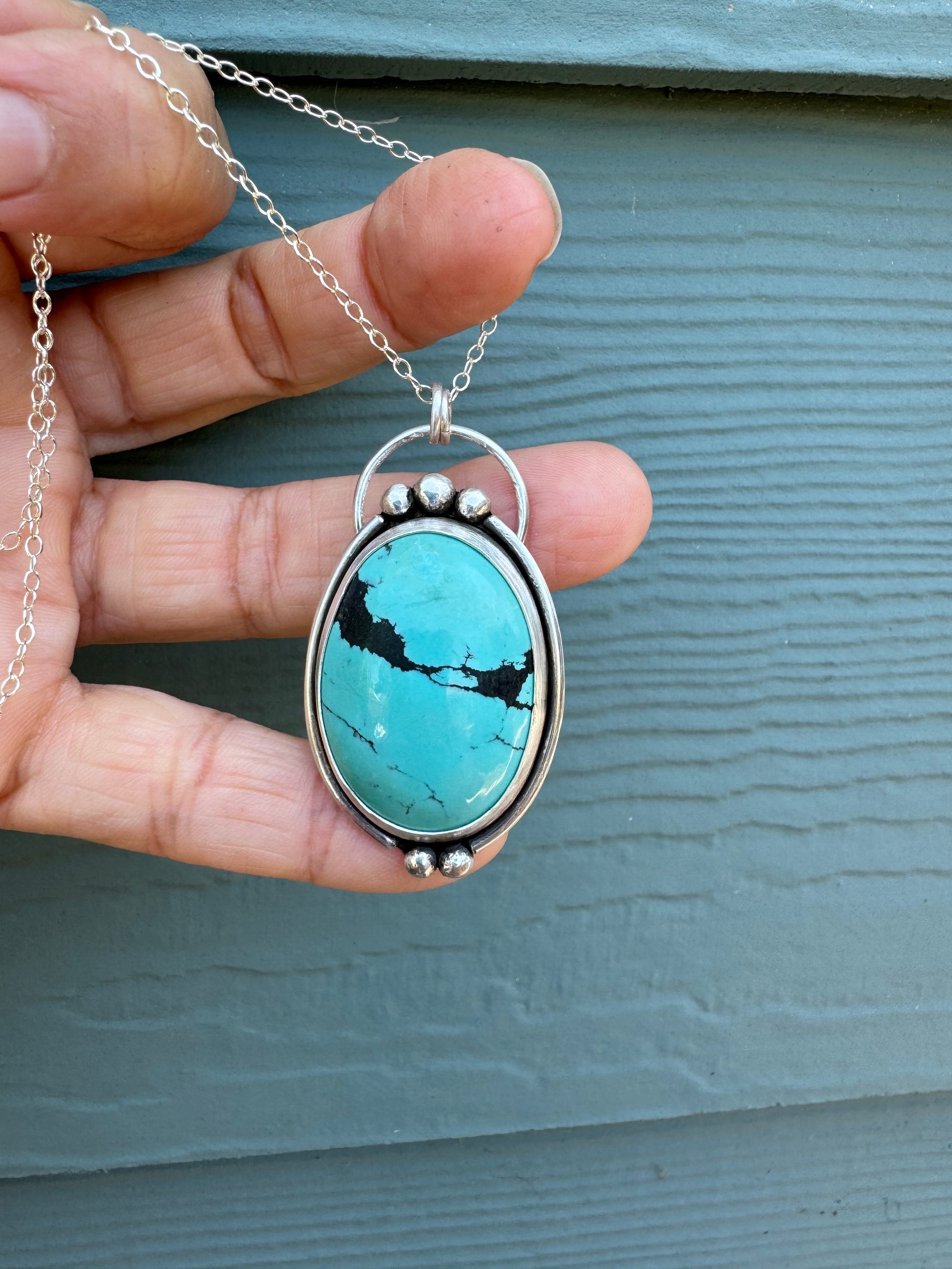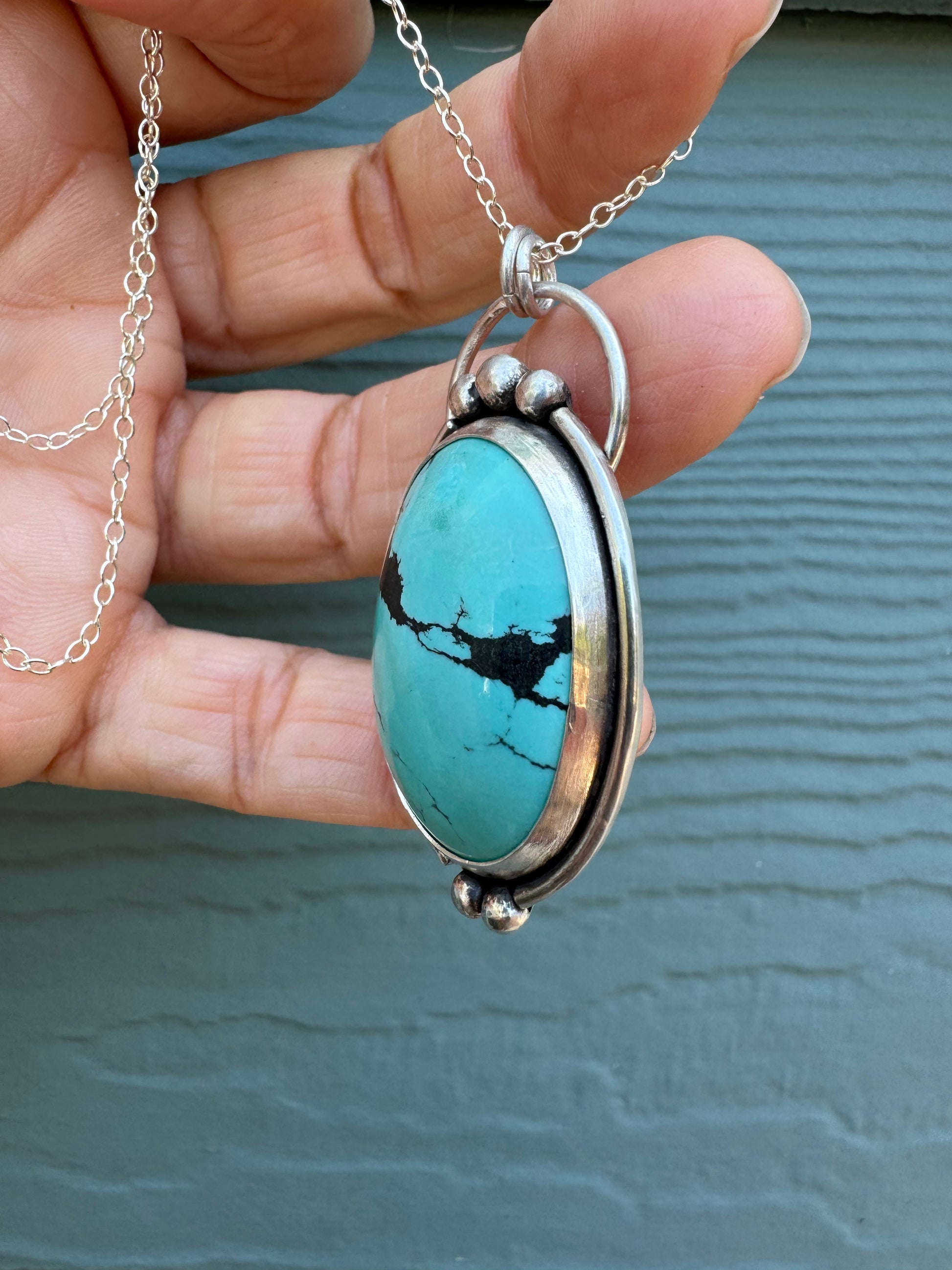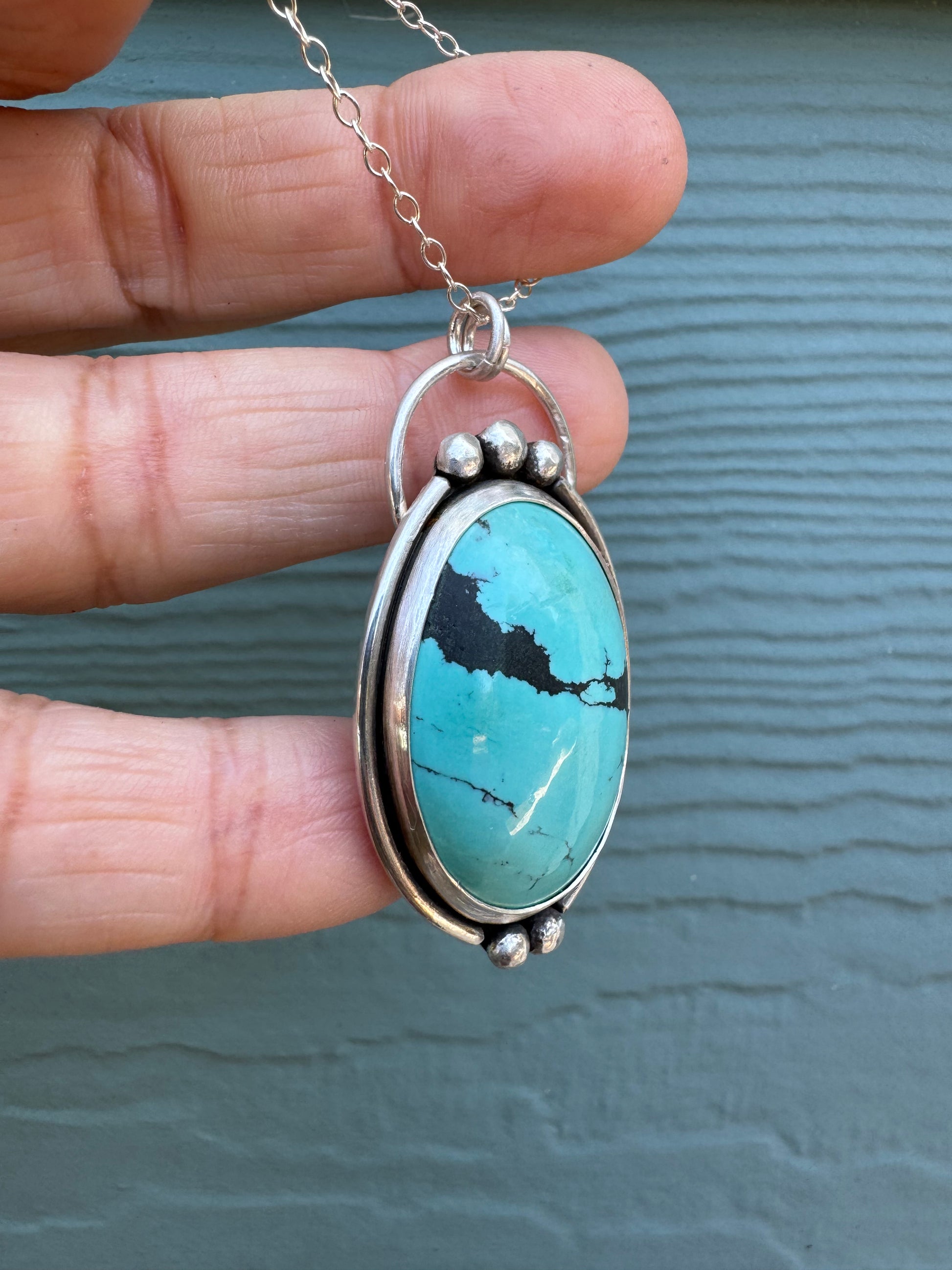 Channel your inner boho chic spirit. Hand-crafted sterling silver hugs this exceptional blue turquoise stone. Featuring a unique streak of black webbing, this is a Wildstone favorite!